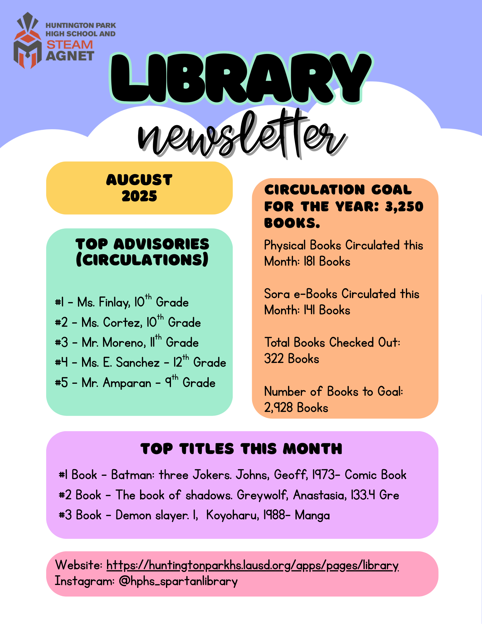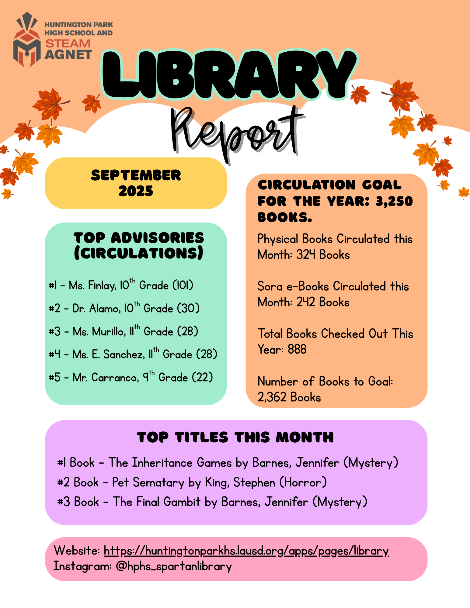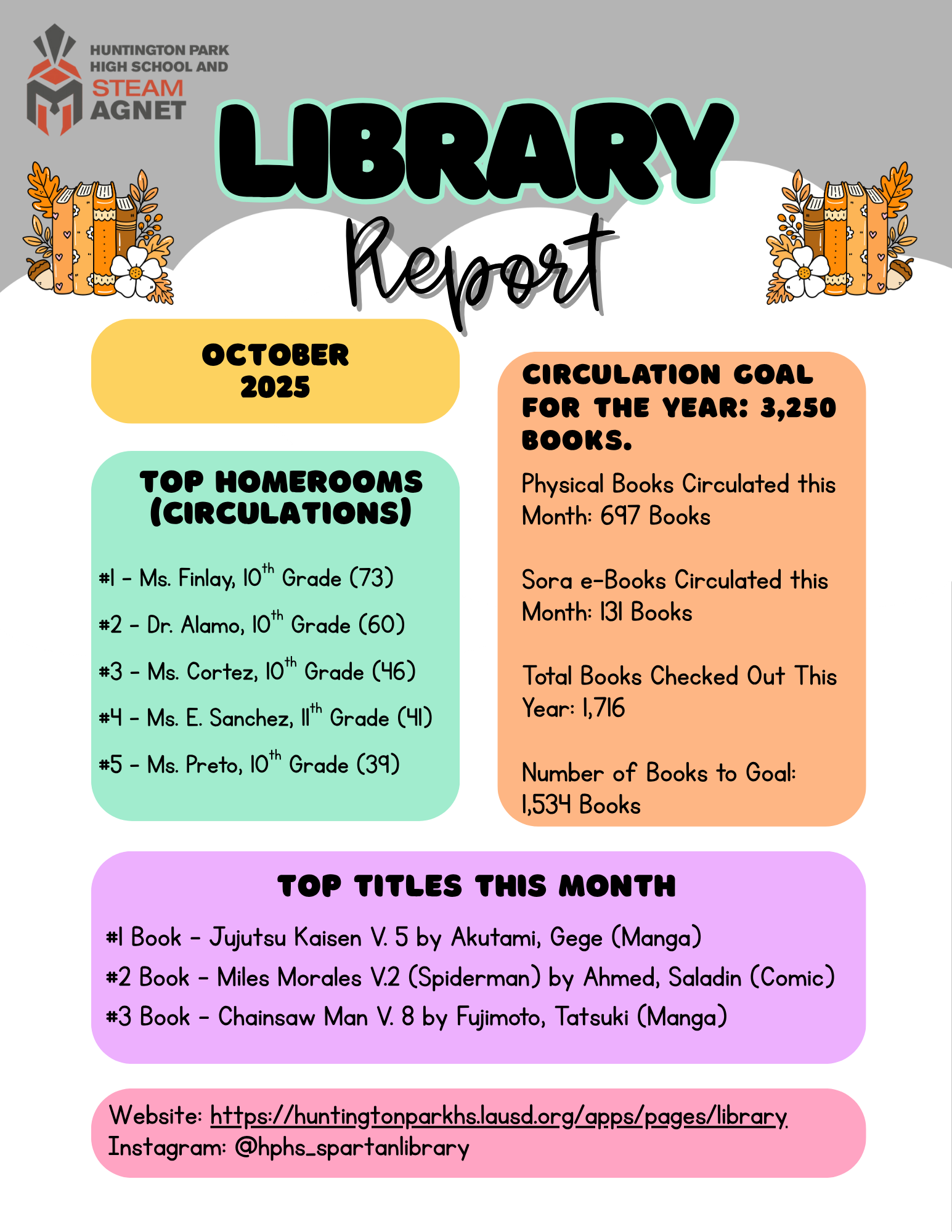 As students of Huntington Park HS (LAUSD) and community members of the City of Huntington Park, you have access to two Public Libraries.